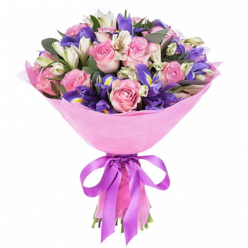 Букет состоит из 13 розовых роз, 9 ирисов, 5 альстромерий, зелень, красивая упаковка, атласная лента.