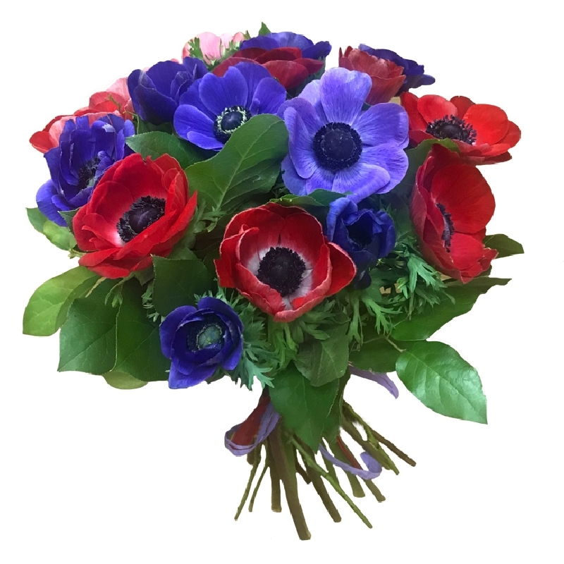 Букет состоит из 9 красных анемонов, 8 синих анемонов, прозрачная упаковка, атласная лента.