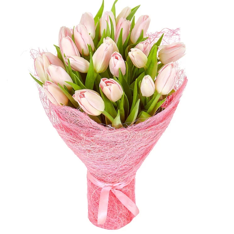 Букет состоит из 21 розовый тюльпан, красивая упаковка, атласная лента.