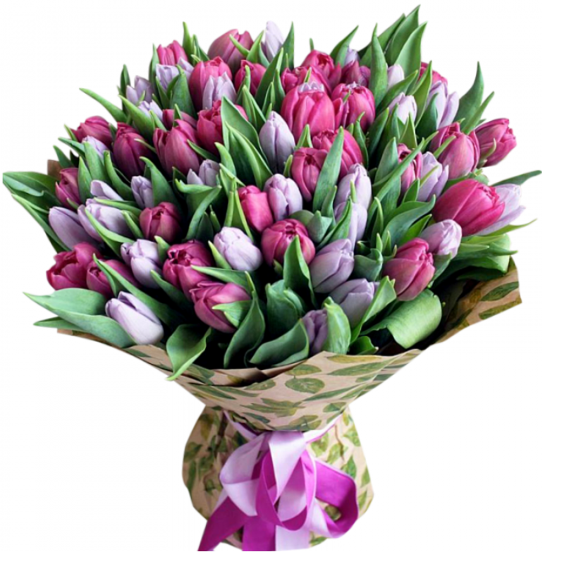 Букет состоит из 51 сиреневый тюльпан, крафт, атласная лента.