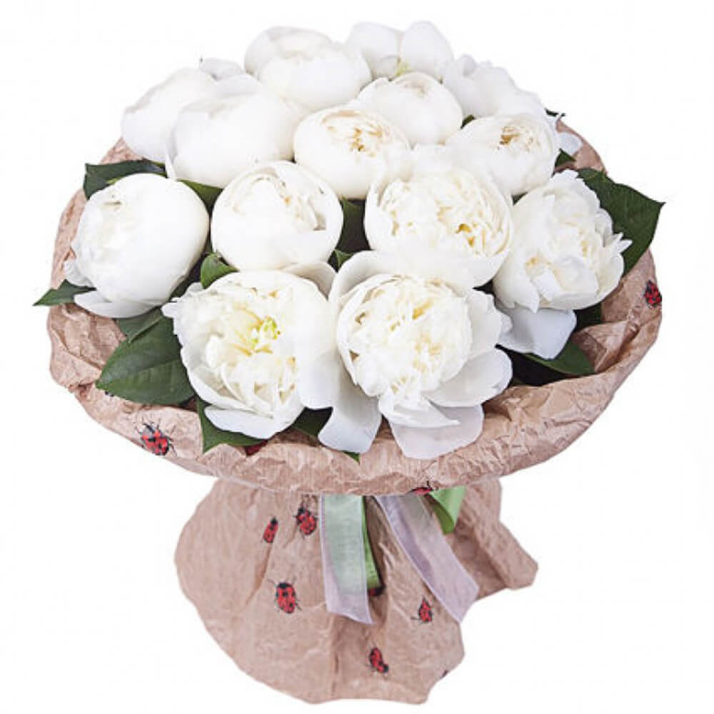 Букет состоит из 15 белых пионов, крафт, атласная лента.