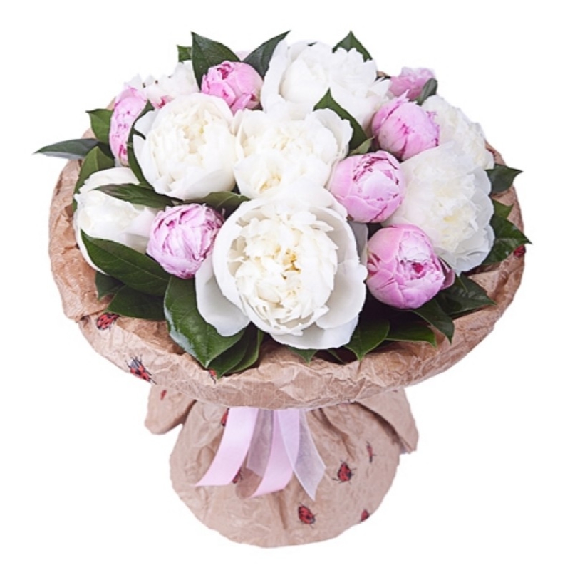 Букет состоит из 9 розовых пионов, 8 белых пионов, салал, крафт, атласная лента.