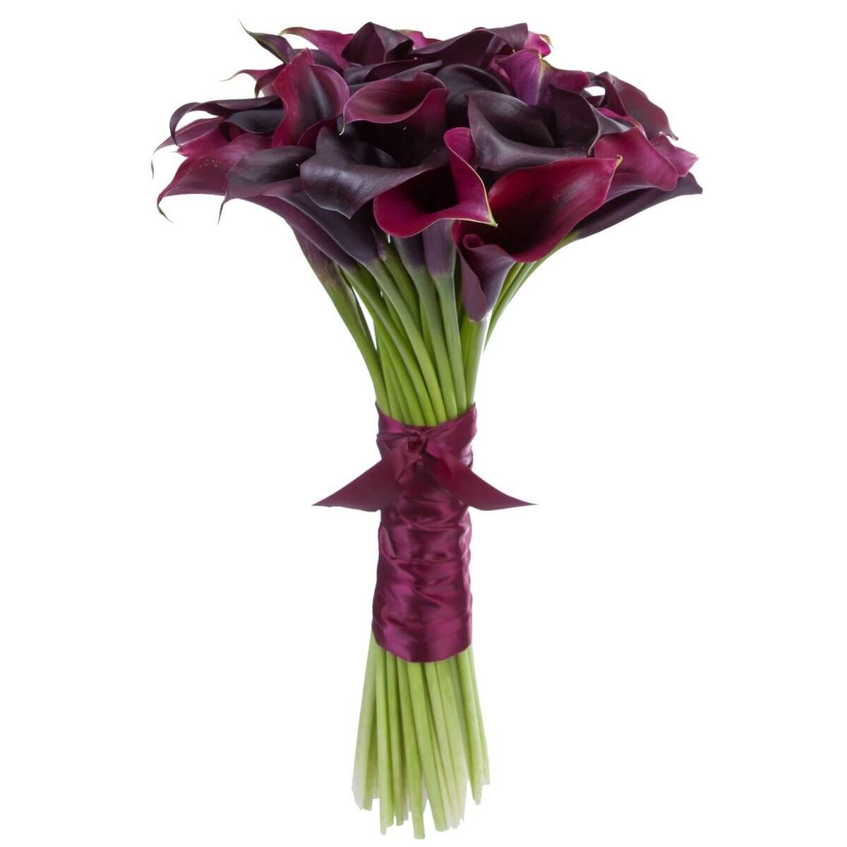 Букет состоит из 25 бордовых калл, прозрачная упаковка, атласная лента.