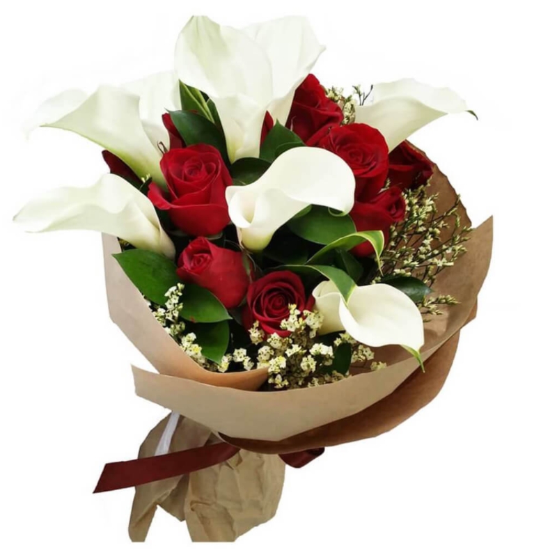 Букет состоит из 11 роз, 6 калл, декоративная зелень, крафт, атласная лента.