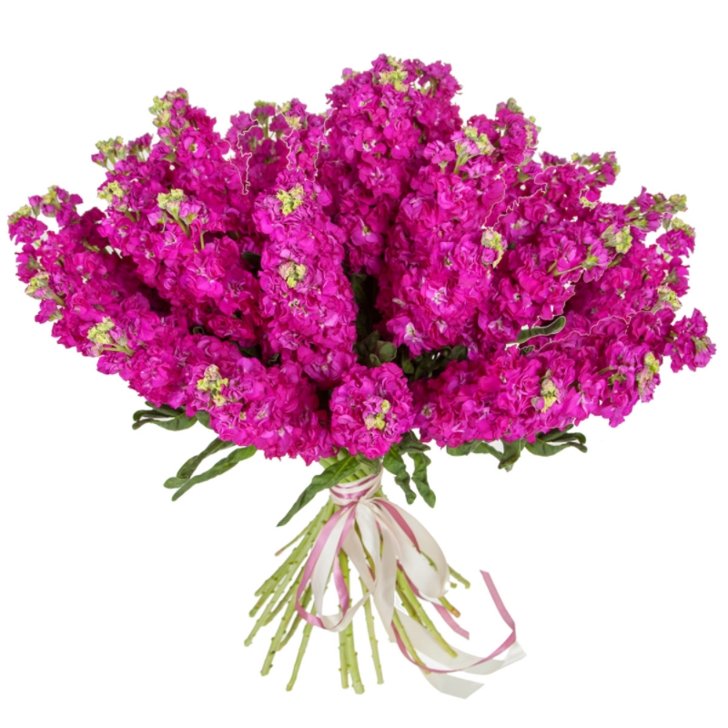 Букет состоит из 25 малиновых маттиол, прозрачная упаковка, атласная лента.
