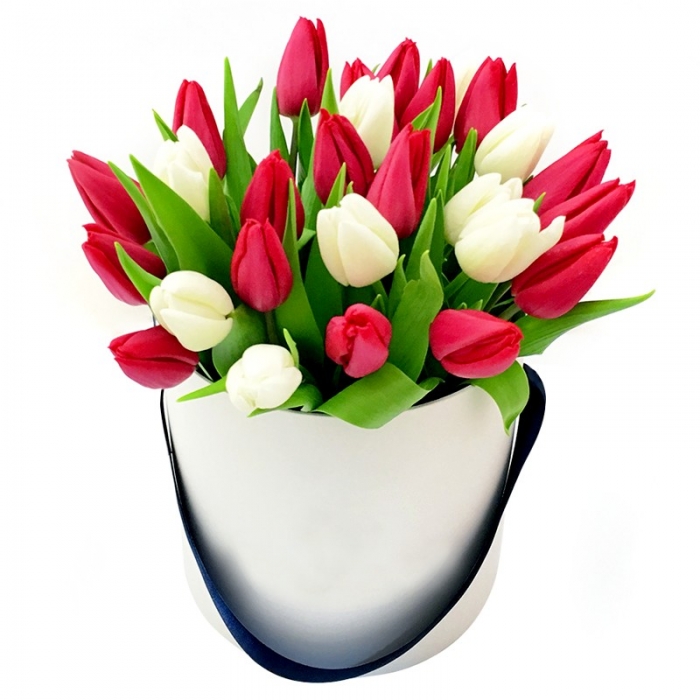 MIX из 27 белых и красных тюльпанов, коробка, оазис.