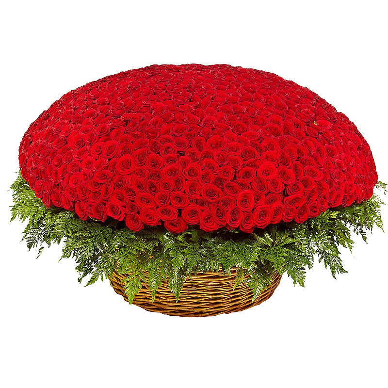 Букет состоит из 1001 красная роза, зелень, корзина.