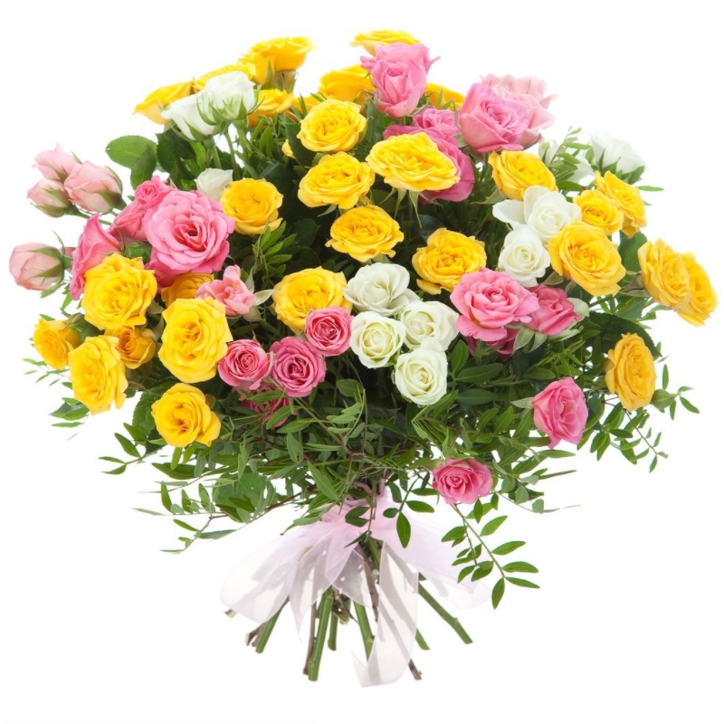 Букет состоит из MIX из 15 кустовых роз, прозрачная упаковка, атласная лента.