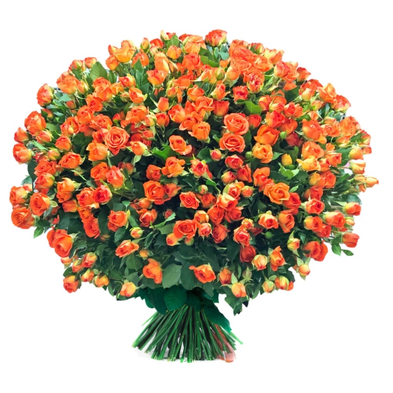 Букет состоит из 55 оранжевых кустовых роз, прозрачная упаковка, атласная лента.
