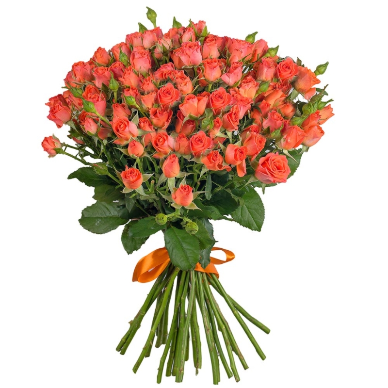 Букет состоит из 25 оранжевых кустовых роз, прозрачная упаковка, атласная лента.