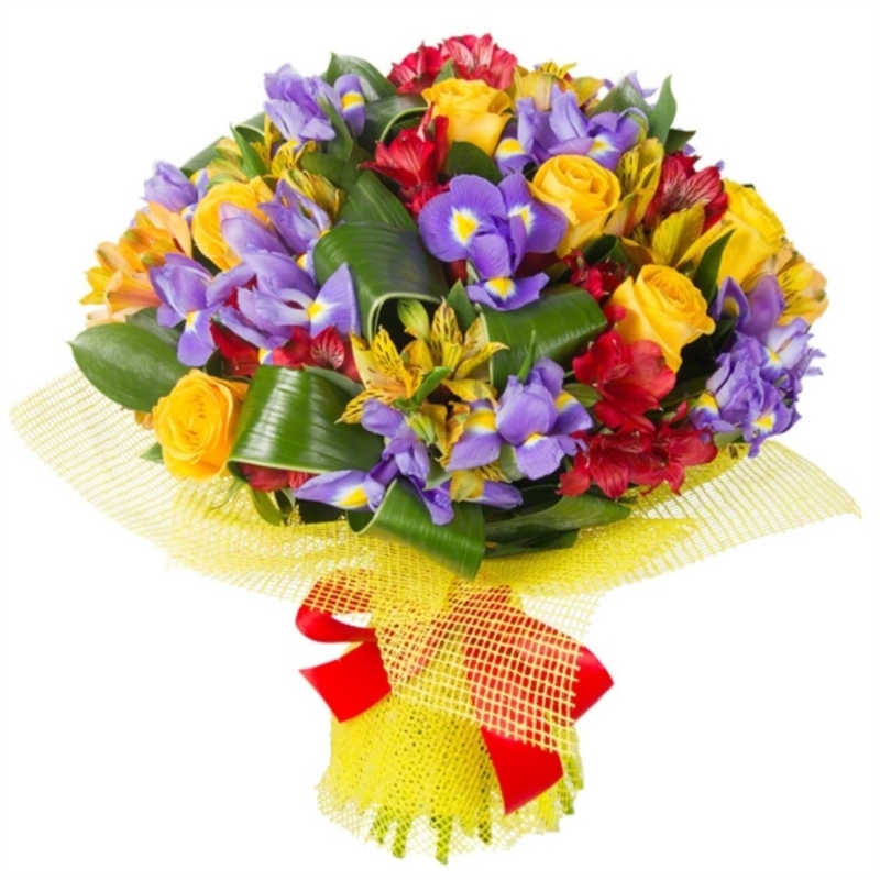 Букет состоит из 7 желтых роз, 15 ирисов, 11 желтых и белых альстромерий, аспидистра, сетка, атласная лента.