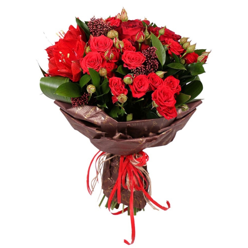 Букет состоит из 3 розы, 4 кустовые розы, 1 амариллис, 3 цветка скиммии, аспидистра, зелень, крафт, атласная лента.