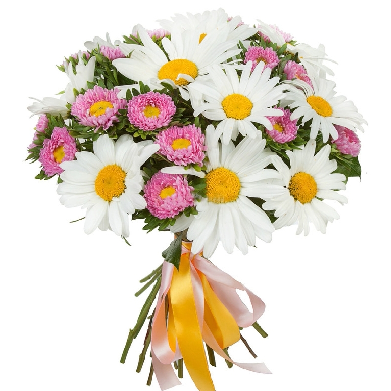 Букет состоит из 15 ромашек, 10 розовых астр, зелень, прозрачная упаковка, атласная лента.