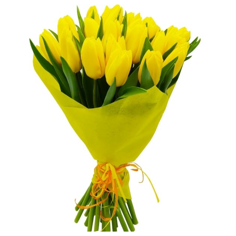 Букет состоит из 21 желтый тюльпан, желтая упаковка.