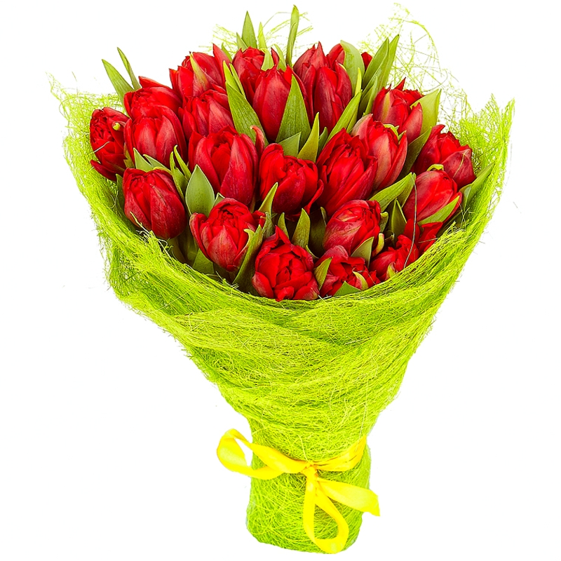 Букет состоит из 25 красных тюльпанов, красивая упаковка, атласная лента.