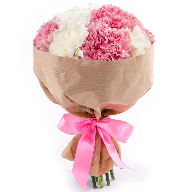 Букет состоит из 8 белых гвоздик, 7 розовых гвоздик, крафт, атласная лента.