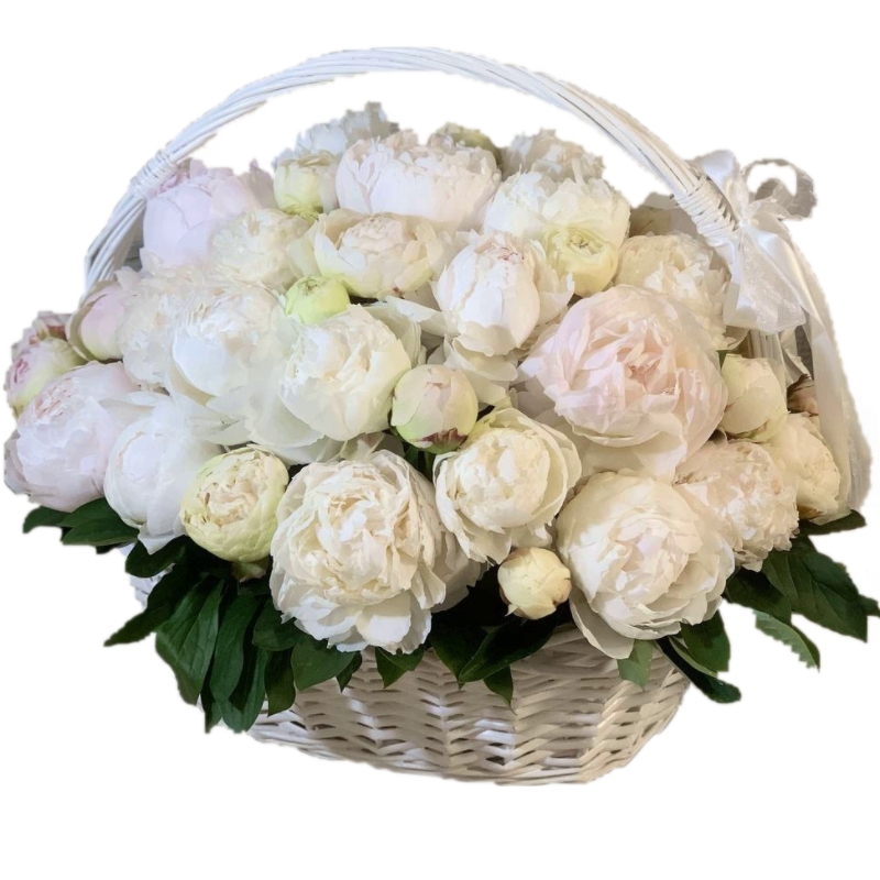 Букет состоит из 51 белый пион, салал, корзина, оазис.