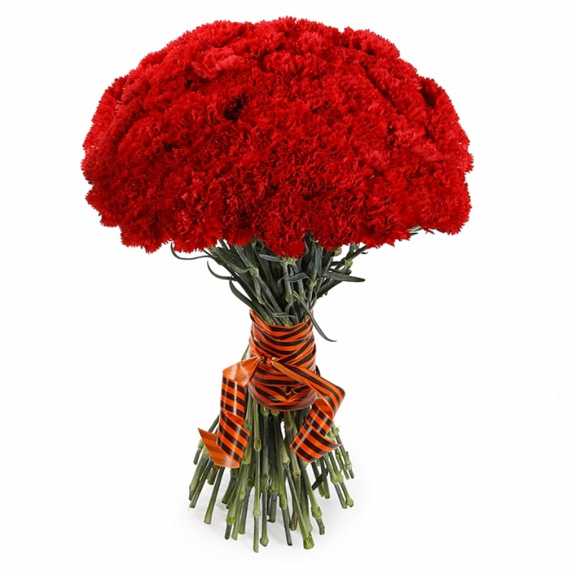 Букет состоит из 51 красная гвоздика, прозрачная упаковка, атласная лента.