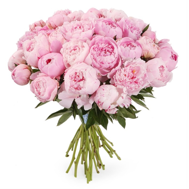 Букет состоит из 35 розовых пионов, прозрачная упаковка, атласная лента.