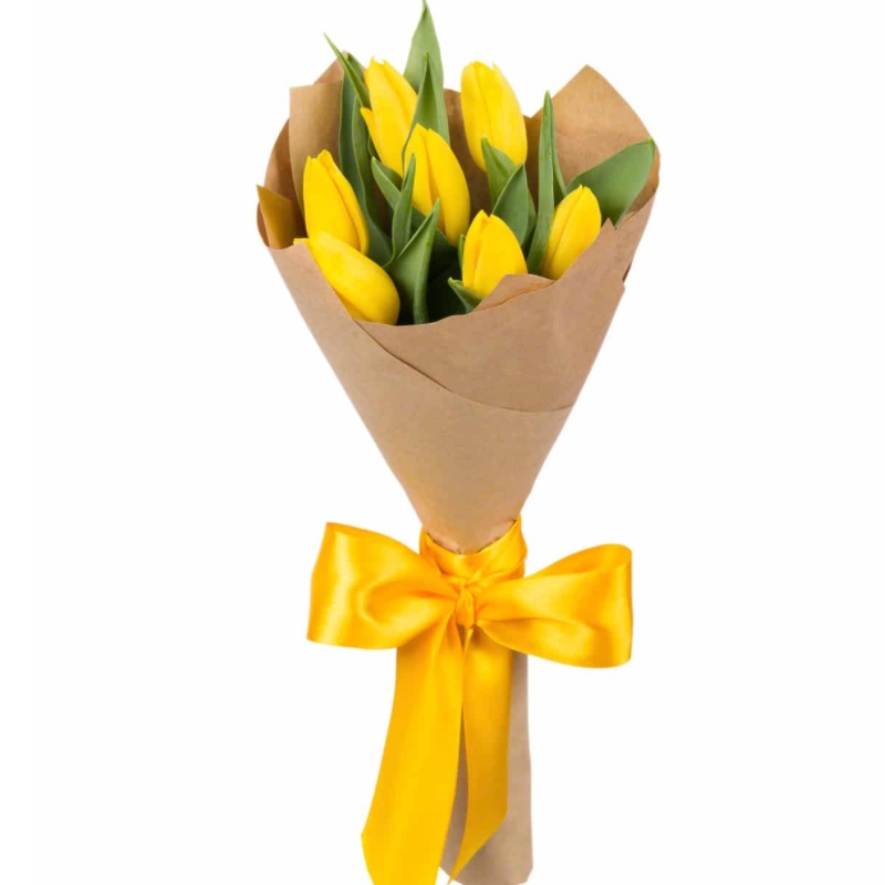 Букет состоит из 7 желтых тюльпанов, крафт, атласная лента.