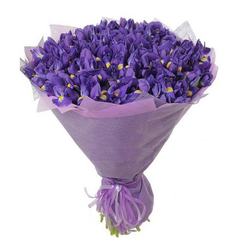 Букет состоит из 75 фиолетовых ириса, красивая упаковка, атласная лента.