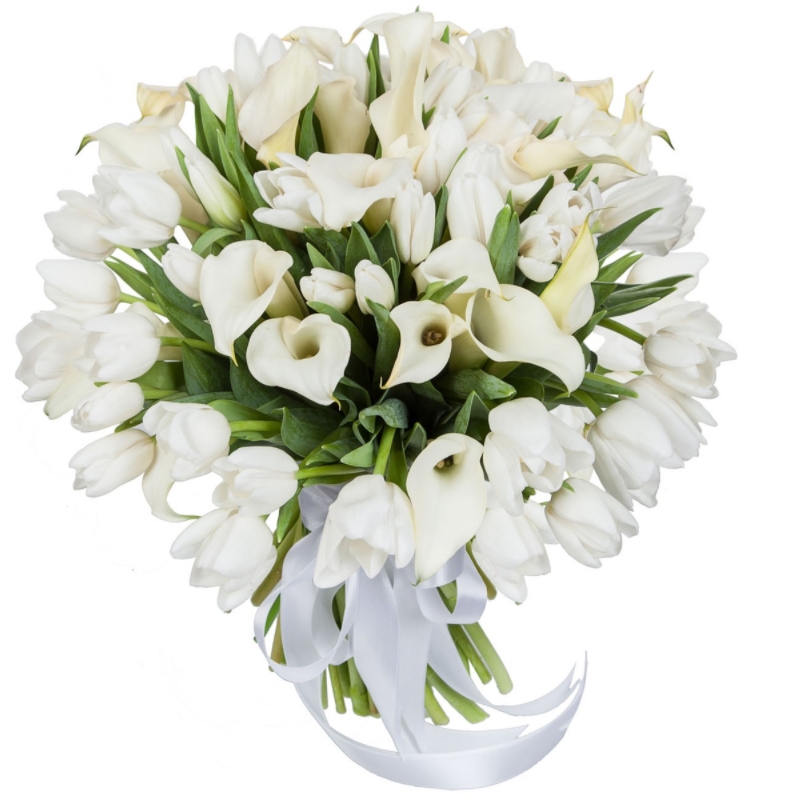 Букет состоит из 15 белых калл, 40 белых тюльпанов, прозрачная упаковка, атласная лента.