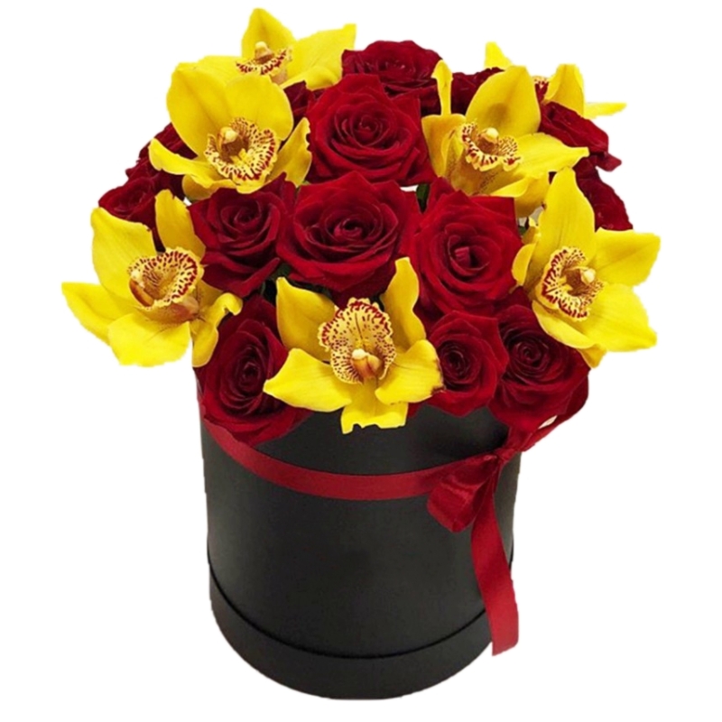 Букет из роз и орхидей в коробке "Гусар"