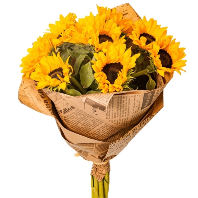 Букет состоит из 9 подсолнухов, упаковка, лента.
