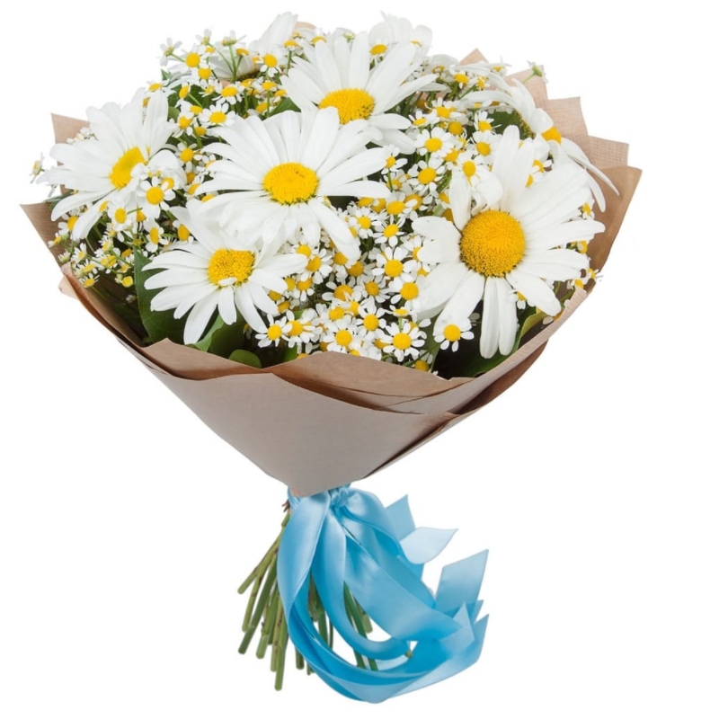 Букет состоит из 11 садовых ромашек, 6 веток танацетума, крафт, атласная лента.