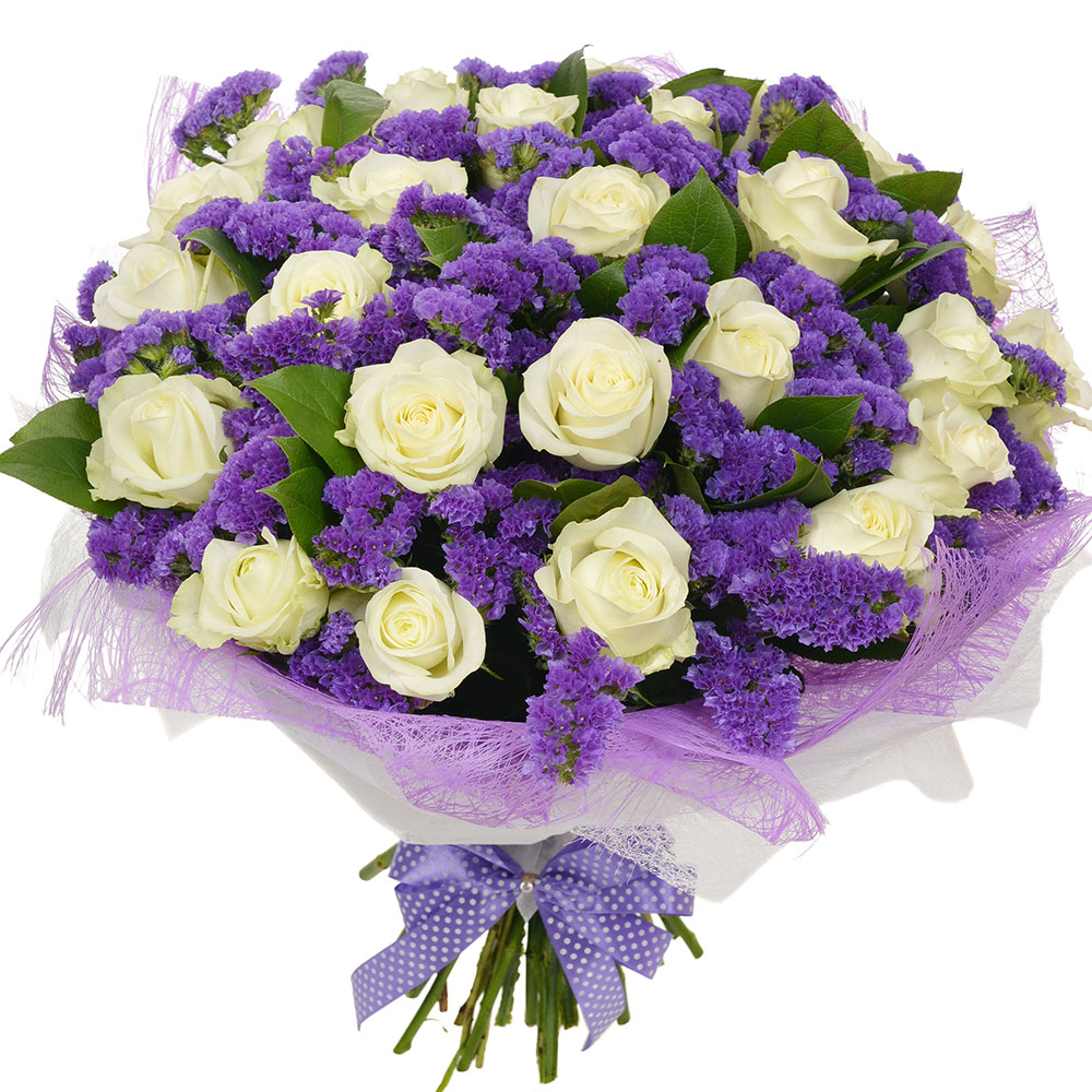 Букет состоит из 25 белых роз, 11 статица, зелень, красивая упаковка.