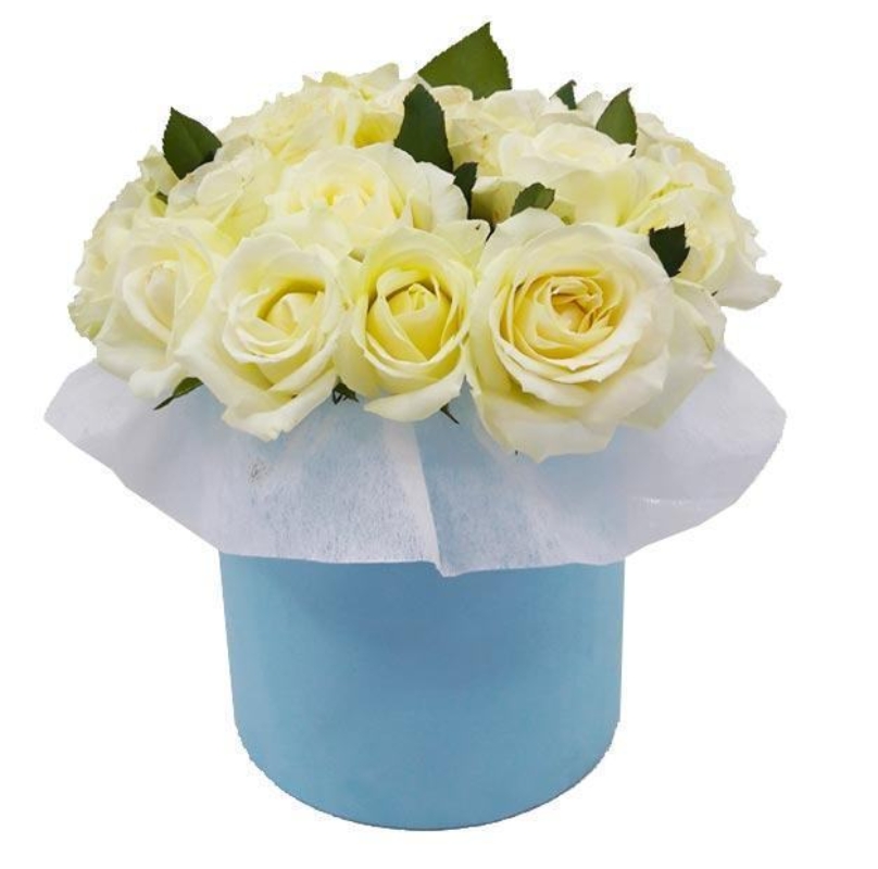 Букет состоит из 21 белая роза, коробка, зелень, оазис.