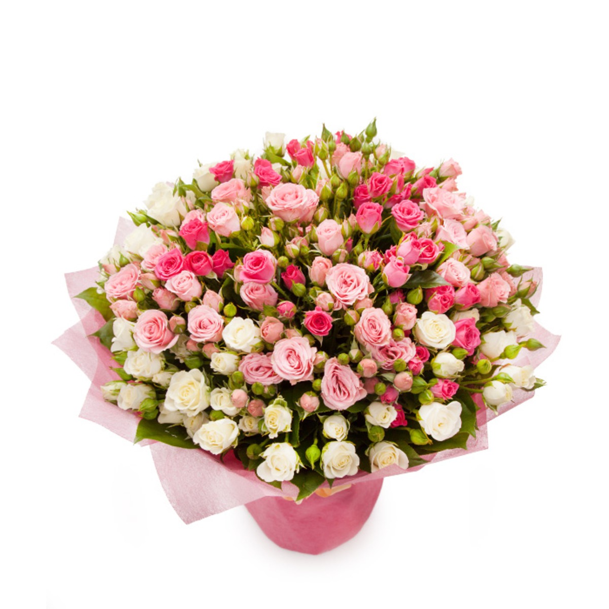 Букет состоит из 51 ветка белой и розовой кустовой розы, красивая упаковка.