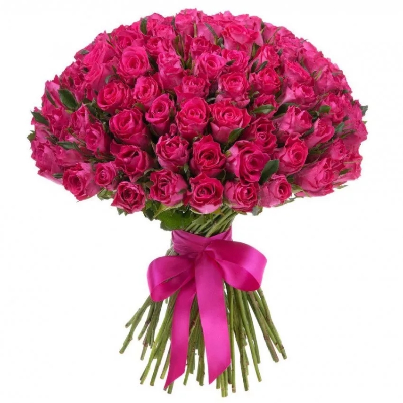 Букет состоит из 101 малиновая роза, прозрачная упаковка, атласная лента.