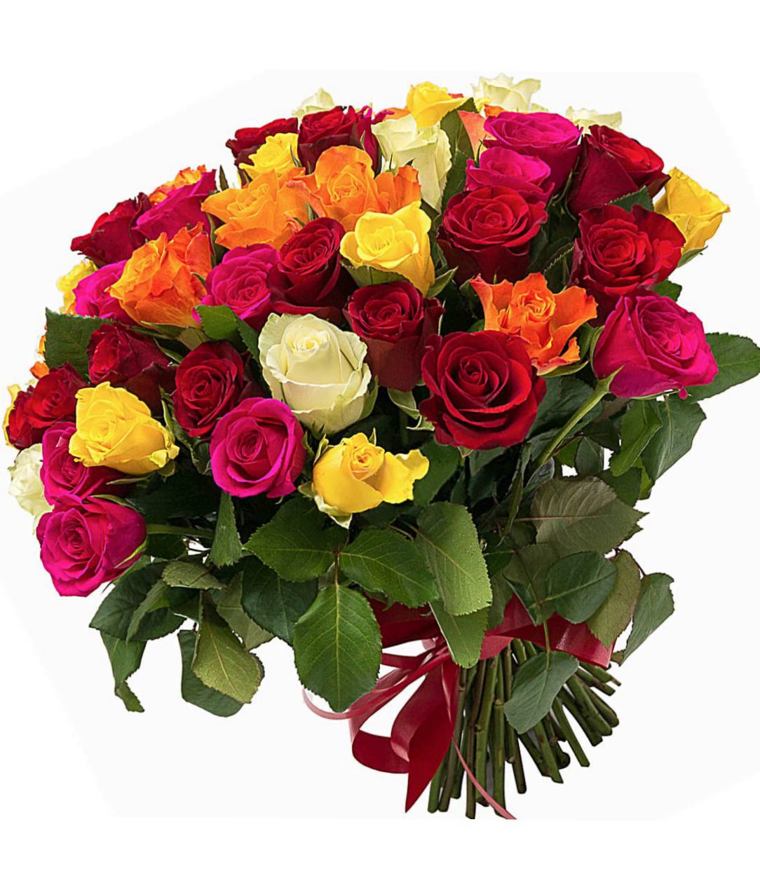 Букет состоит из MIX из 55 роз, прозрачная упаковка, атласная лента.