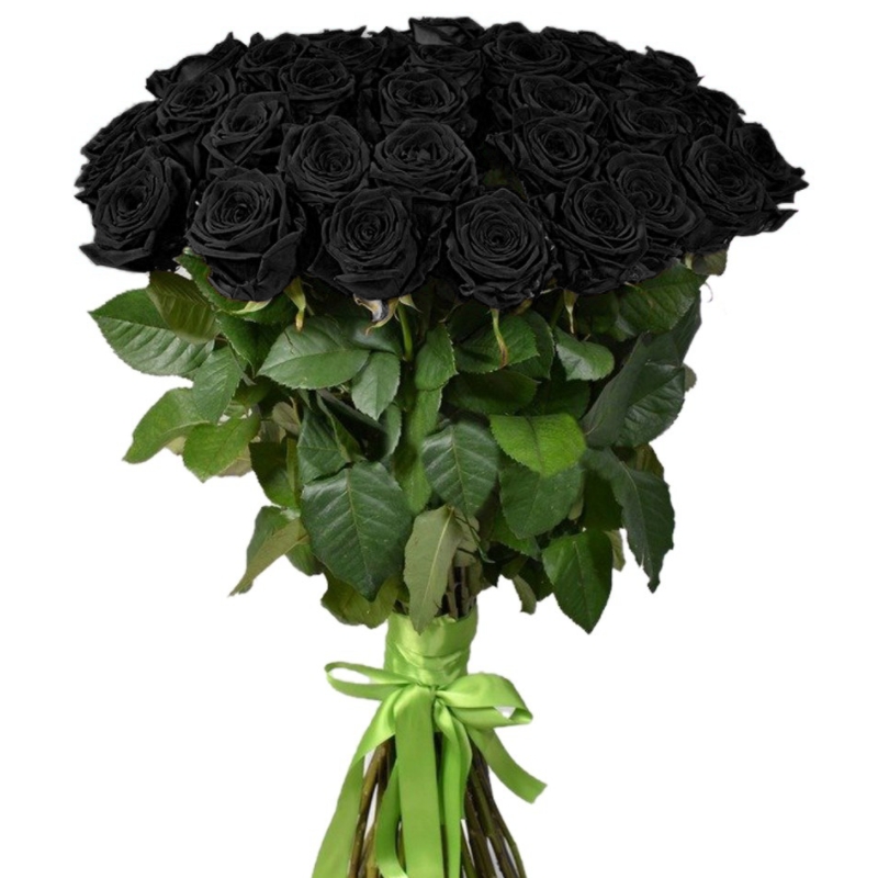 Букет состоит из 45 черных роз, прозрачная упаковка, атласная лента.
