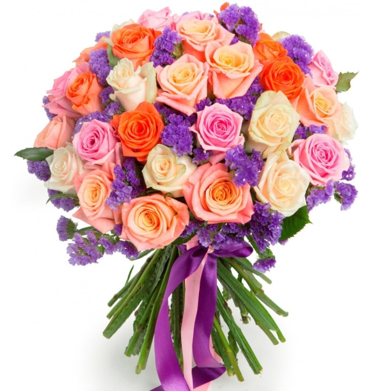 Букет состоит из MIX из 45 роз, 7 статица, прозрачная упаковка, атласная лента.